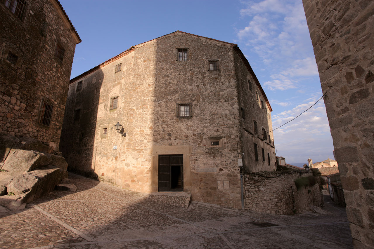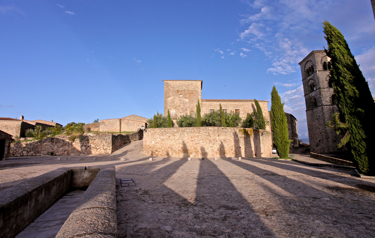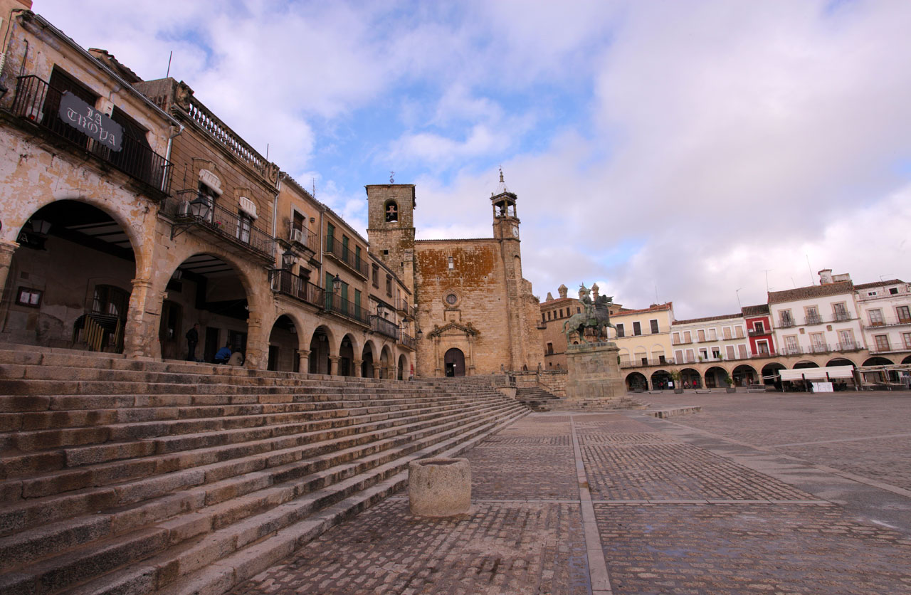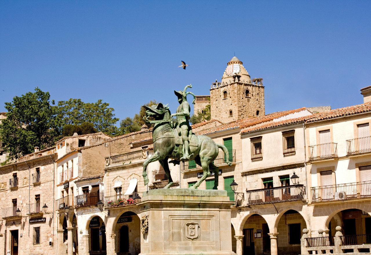After climbing up to the Castle, standing at the highest point of the town, from where you have magnificent views, you can lose yourself in the town's streets. Once inside the walled enclosure, the Chapel of San Pablo ( 16th century) and the four gates remaining of the original seven are well worth a look, as are the Alberca - a water deposit hewn of solid rock - and a Hispanic-Moorish water cistern. From there, carry on to the Church of Santiago, a 12th-century Romanesque building, subsequently restored in the 17th century, where the sculpted, wooden figure of the Christ of the Waters is housed. Continuing on your way you will come to Plaza Mayor, in the heart of the town centre. Renaissance in style, this porticoed square is presided over by the equestrian statue of Francisco Pizarro. Traders and artisans gathered there until the homes of the most important noble families were built there in the 16th century, such as the House of La Cadena, that of the Orellana, or that of the Chaves-Cárdenas. Also worthy of note is the Palacio de la Conquista, which was started by Hernando Pizarro, brother of the discoverer, and which has an outstanding balcony; the Palacio de los duques de San Carlos, the Palacio de Piedras Albas or the Palacio de los Carvajal-Vargas with its corner balcony and its chimneys. You also have the Church of San Martín de Tours and the Church of Santa María la Mayor nearby. The latter is one of the most important religious monuments in the area owing to its age - the Julia Tower dates from the 13th century - and its unmistakeable architecture, which bears the marks of the restoration work carried out in the 14th and 16th century.