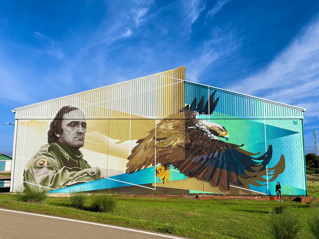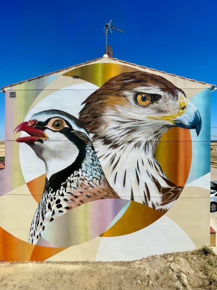 Jesús Mateos Brea ha realizado obras de diferentes temáticas en Extremadura. Muchas de ellas están protagonizadas por aves: en Salorino pueden verse varias especies representativas del Tajo Internacional (cigüeña negra, perdiz, águila perdicera…) y ‘Orgullo’, con un gallo azul extremeño; en Carbajo, ‘Imperial’ rinde homenaje a Félix Rodríguez de la Fuente y a una de sus aves favoritas: el águila imperial ibérica; en Villar del Pedroso, ‘Odisea’ muestra un mochuelo rodeado de ositos de gominola; en Plasencia, un mural con rabilargos y otro, realizado con Chefo y Sojo, en el que aparecen una lechuza, un búho real, un rabilargo, un colirrojo real…