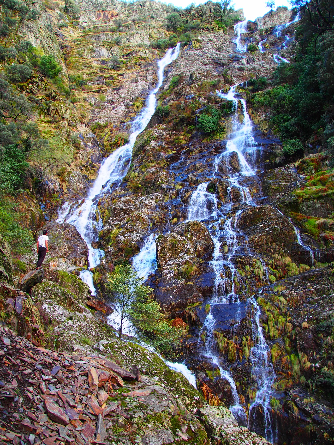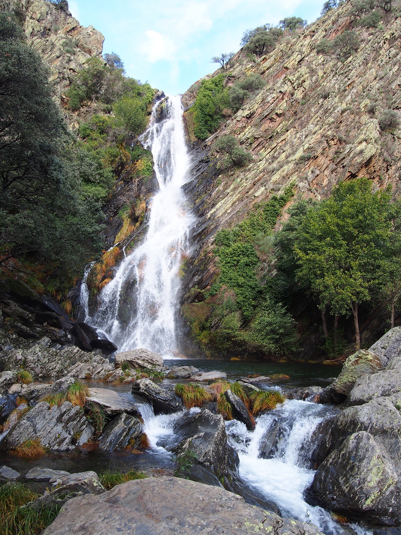 Salto de agua de 200 metros entre rocas de pizarra, el paisaje típico de Las Hurdes. Cuenta con un mirador accesible para que todas las personas puedan disfrutar de esta belleza natural. Acceso por pista forestal desde la carretera de Ovejuela.